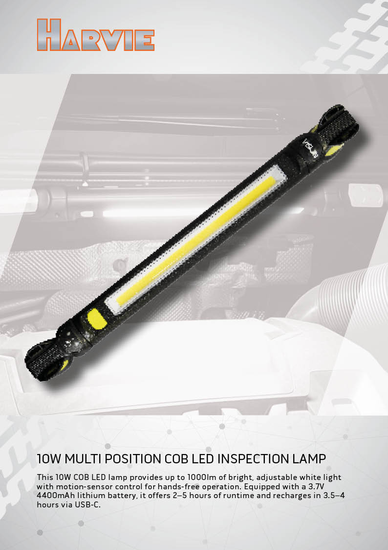 This 10W COB LED lamp provides up to 1000lm of bright, adjustable white light with motion-sensor control for hands-free operation. Equipped with a 3.7V 4400mAh lithium battery, it offers 2–5 hours of runtime and recharges in 3.5–4 hours via USB-C.